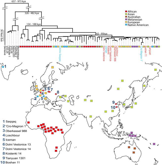 Utilisation des génomes mitochondriaux complets de 10 hommes archaïques datés solidement. Ils permettent la reconstitution d'une phylogénie incorporant aussi 63 ADN mitochondriaux d'Hommes modernes.