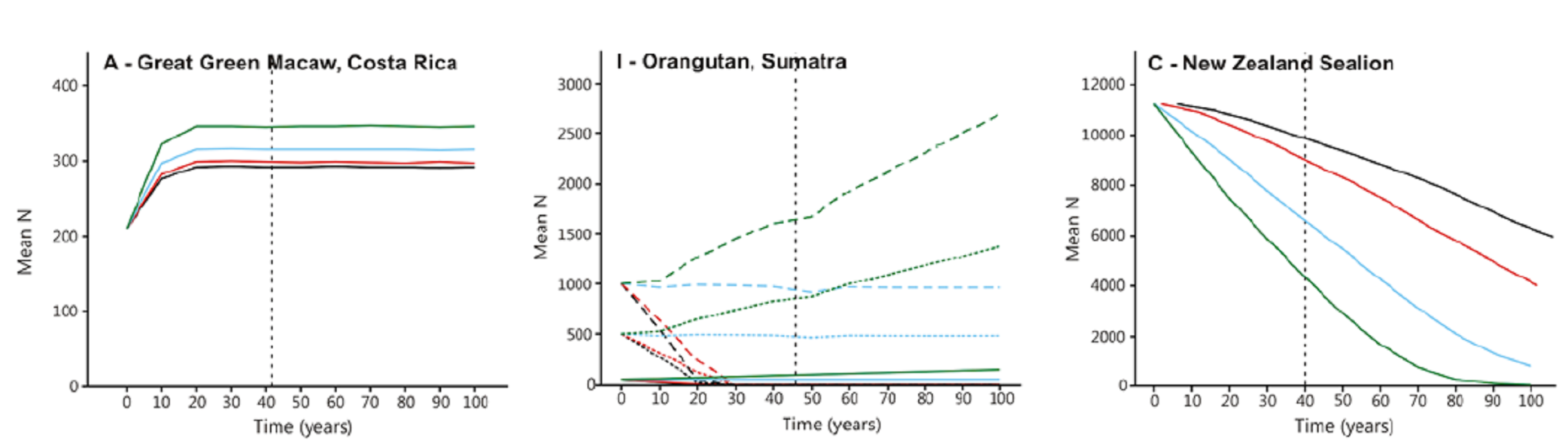 Trois exemples d'évolution des tailles de population pour 3 des 9 espèces étudiées : le macaque du Costa Rica (gauche), l'orange-outan à Sumatra (centre), le lion de mer à Nouvelle-Zélande (droite). Les courbes pleines représentent des résultats de simulation pour quatre niveaux d'écotourisme : fort (vert), moyen (bleu), faible (rouge), et nul (noir).