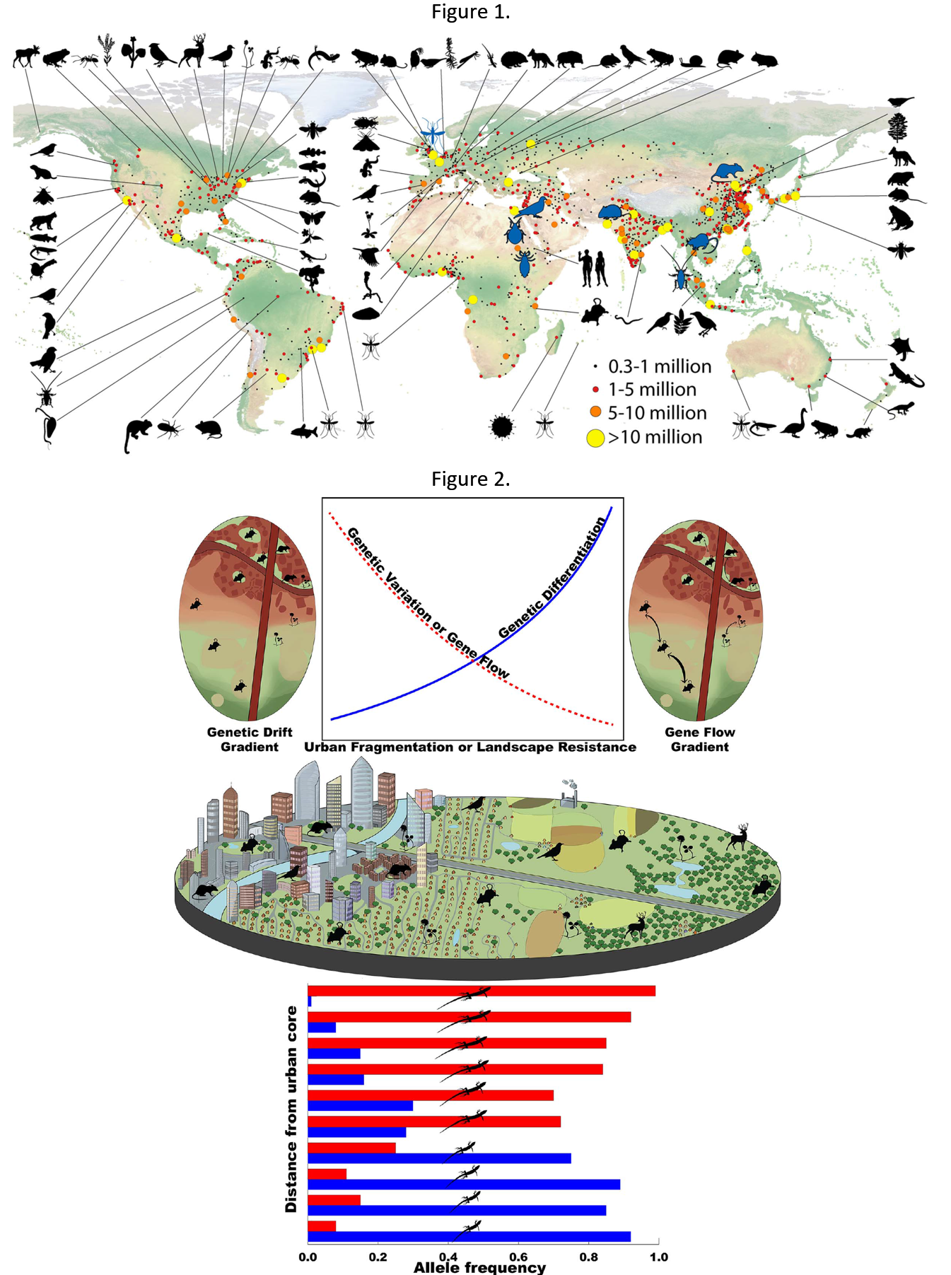 Les villes sont une perturbation unique d’origine anthropique. Beaucoup d’organismes, tels que le rat, les punaises, et pigeons parmi bien d’autres, ont développés des adaptations au cours de longue période pour cohabiter avec les zones urbaines. Cette review prend en compte des articles ayant traité les processus évolutifs adaptatifs (sélection sexuelle et naturelle) et non adaptatifs (flux de gènes, dérive génétique, et mutations) dans de nombreux organismes aussi divers que les microbes, les plantes, les insectes, les poissons, les mammifères et les oiseaux (Fig. 1). Dans cette review, les chercheurs ont essayés de savoir si l’urbanisation affectait l’évolution et les mécanismes responsables de ces évolutions. D’autres changements morphologiques, comportementaux, physiologiques, et d’expression de gènes ont été observés, mais ceux-ci peuvent souvent être expliqué par la plasticité phénotypique.