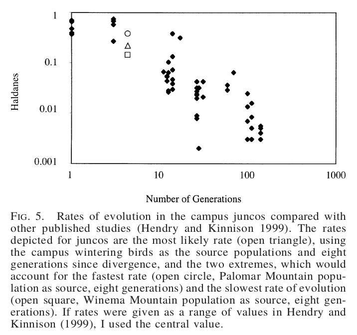 La sélection qui s'opère dans un nouvel habitat peu causer l'évolution rapide d'un trait. Dans le cas des juncos ardoisés, il s'agit de la quantité de blanc dans la queue, qui a diminué d'environ 20% suite à la colonisation du campus UCSD.
