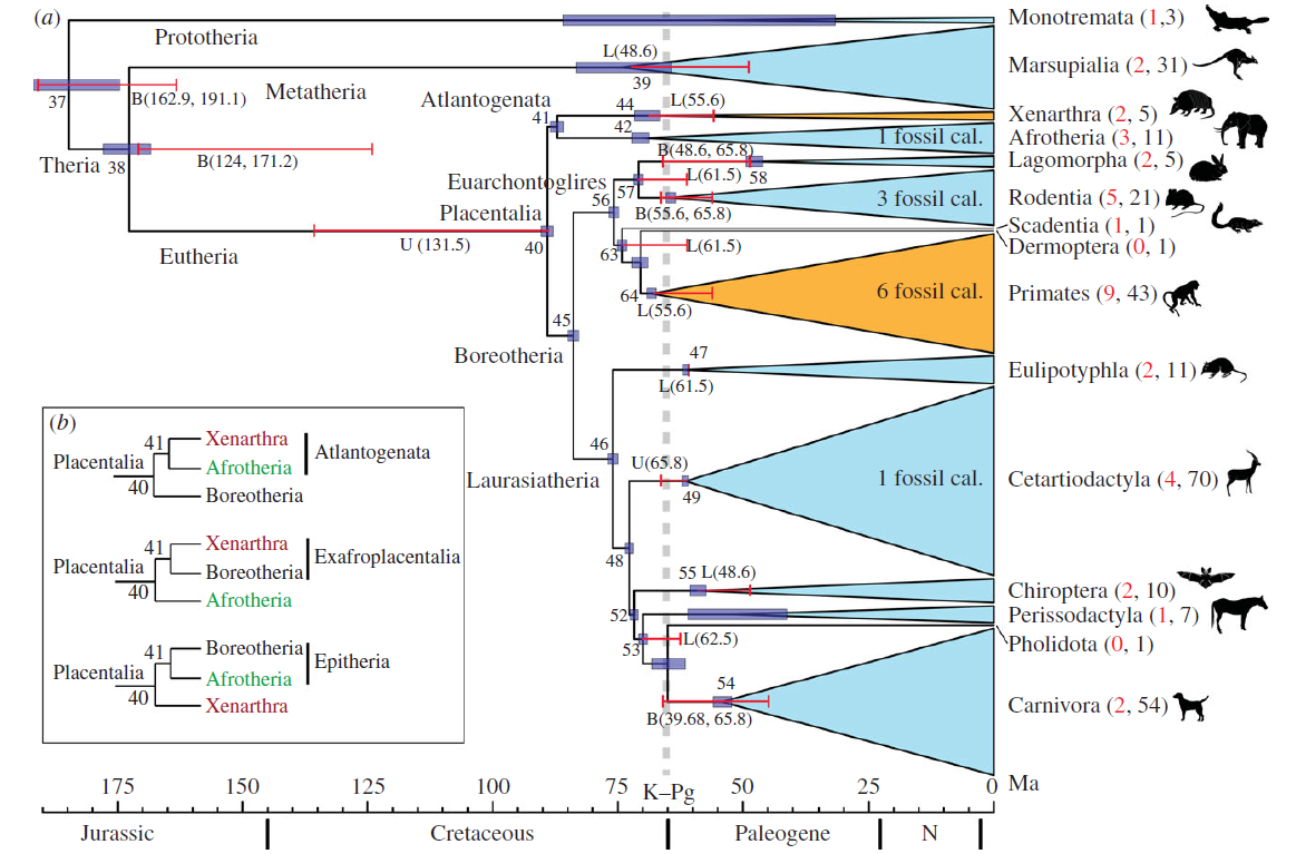 Arbre phylogénétique des mammifères. (a) Les barres horizontales bleues représentent l'intervalle de confiance (95%) de la distribution postérieure pour l'âge des noeuds. Les barres horizontales rouges représentent les calibrations fossiles.