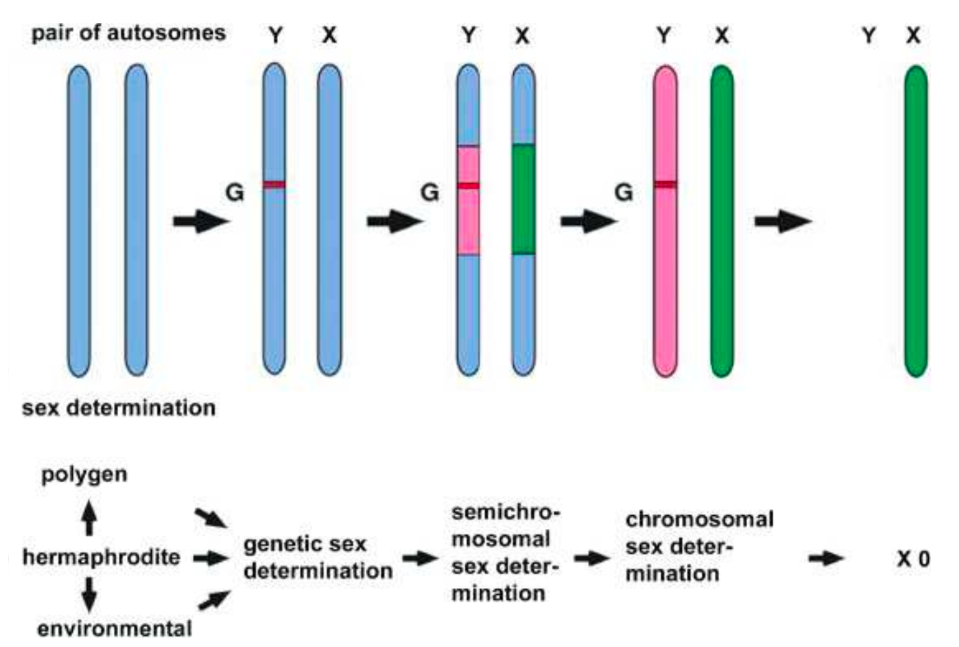 Figure 1: Possible évolution du chromosome Y. La pair de chromosome sexuelle dérive d'une paire de chromosomes homologues. En la présence d'un facteur de détermination sexuel (G) la determination sexuelle est effectuée et un proto chromosome Y né. L'expansion de la région autour du locus de determination sexuelle, où la recombinaison est supprimée (rose), mène à la détermination sexuelle semi-chromosomique. Les changements structurels et génétiques des différents segments du Y forcent une selection par compensation de dosage de gène (vert) dans les régions correspondantes du proto-chromosome X. Une expansion supplémentaire des segments sur le chromosome entier mène à une détermination sexuelle chromosomique. Les changements structurels (heterochromatinization) et l'érosion génétique du Y pourraient finalement mener à la perte du chromosome Y (X0).