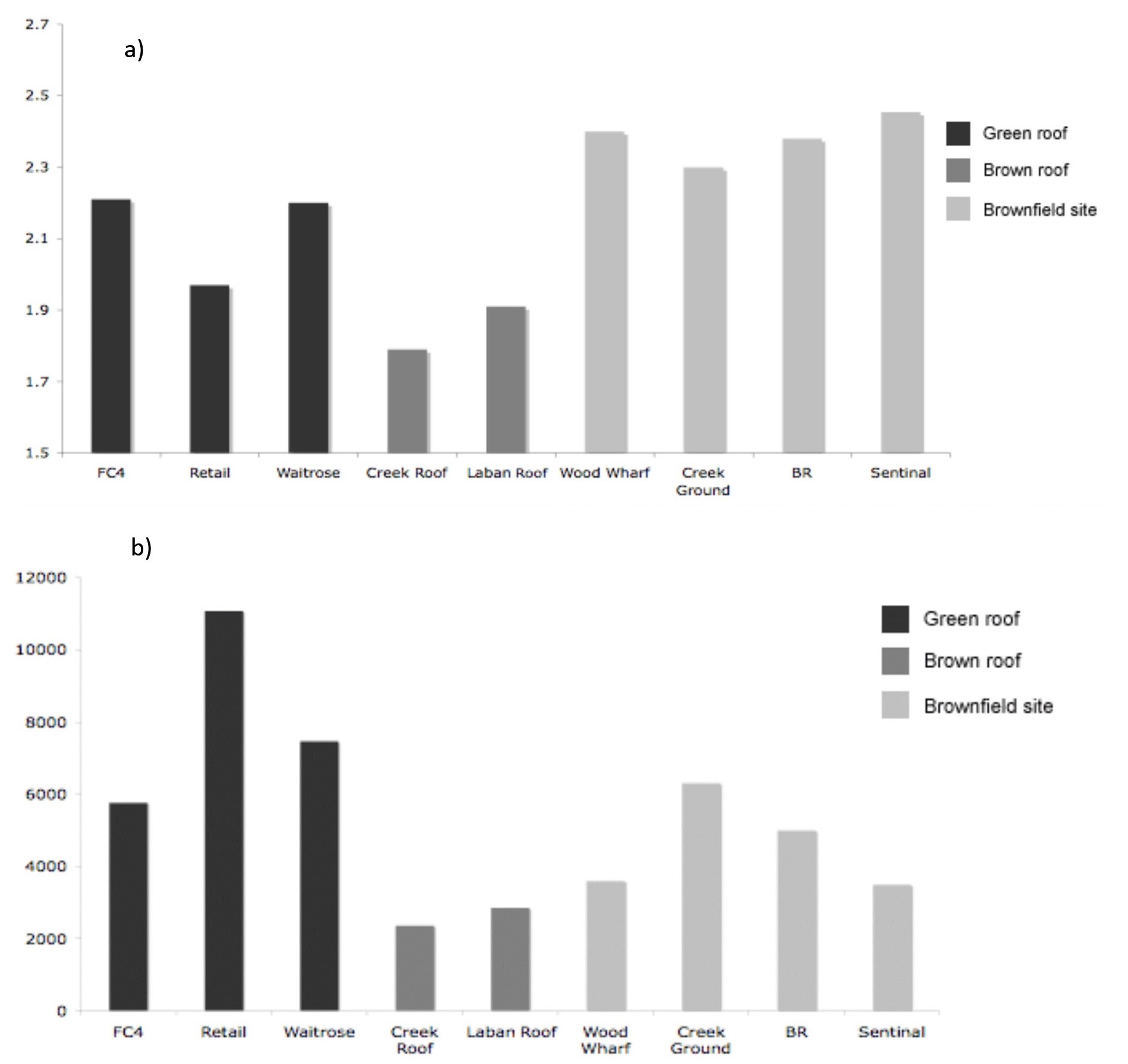 Figure 1. Nombre total d'invertébrés récoltés (a) et Indice de Shannon (b) sur chaque site d'études en 2004. À gauche les 5 toits végétalisés et à droite les 4 sites naturels.