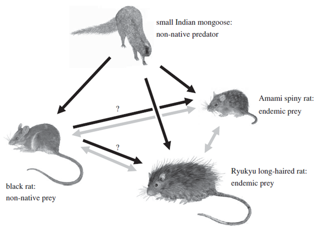 Possible structure trophique de la petite mangouste indienne, du rat épineux Amami, du rat à poils longs Ryukyu et du rat noir sur l'île d'Amami.