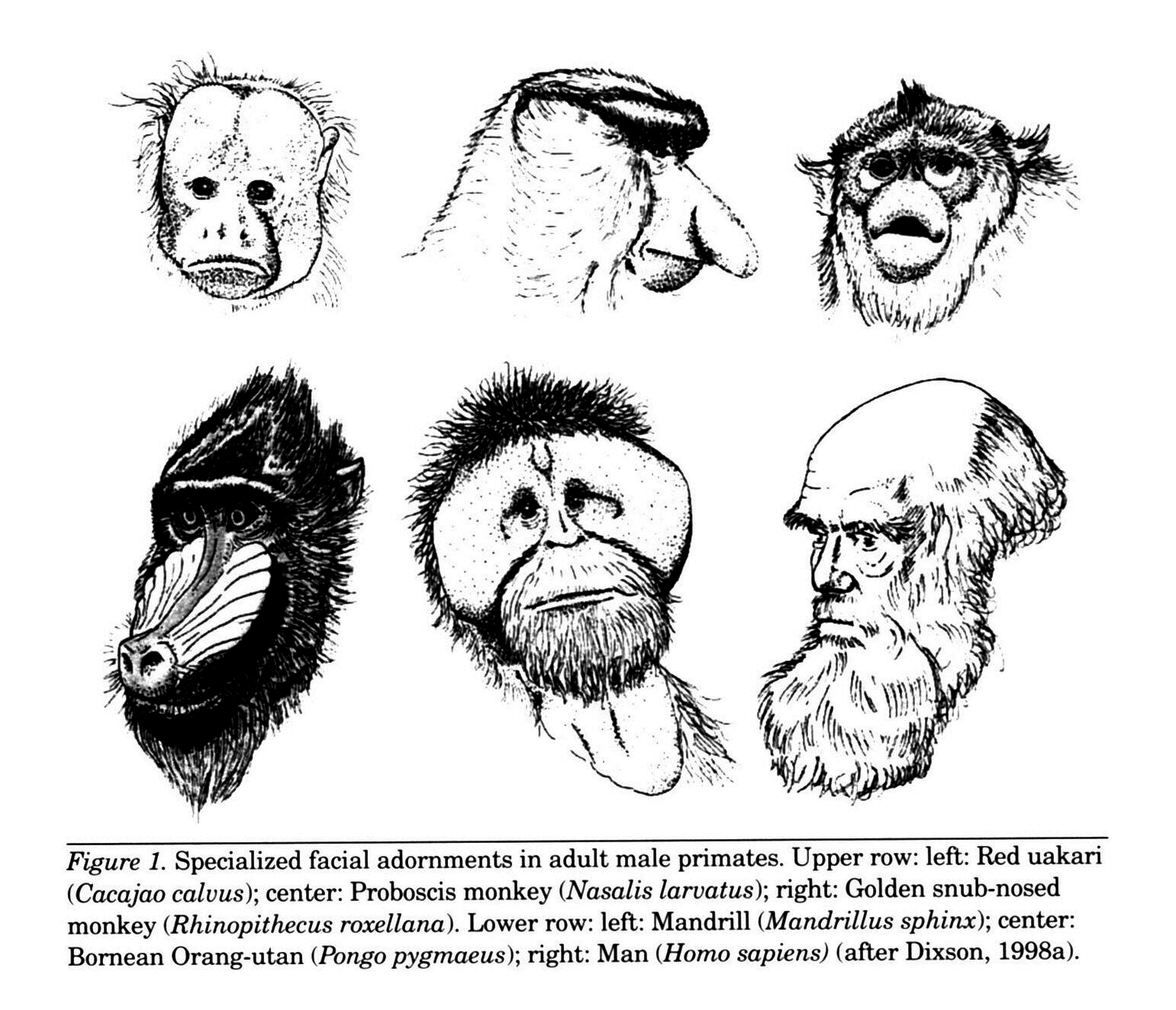 Chez les primates polygames le dimorphisme sexuel est fortement exprimé par la taille du corps et des canines. Les traits sexuels secondaires (peau rouge et bleue brillante couvrant le visage, barbe…), sont également développés chez les anthropoïdes. Dans cet article les auteurs essayent de trouver une corrélation entre l'intensité des traits sexuels secondaire et les stratégies de reproduction (polygame, monogame...) chez les singes, les primates et l'Homo sapiens.