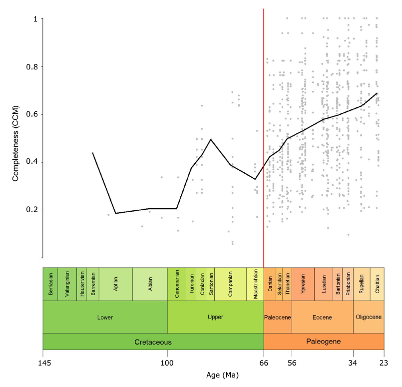 Cette étude propose de mesurer la qualité (ou complétude) des preuves fossile des euthériens. Une forte diminution de la complétude avant la crise K-Pg pourrait ainsi indiquer que le manque de fossile de placentaire au Crétacé pourrait être dû à une pauvreté du registre fossile.