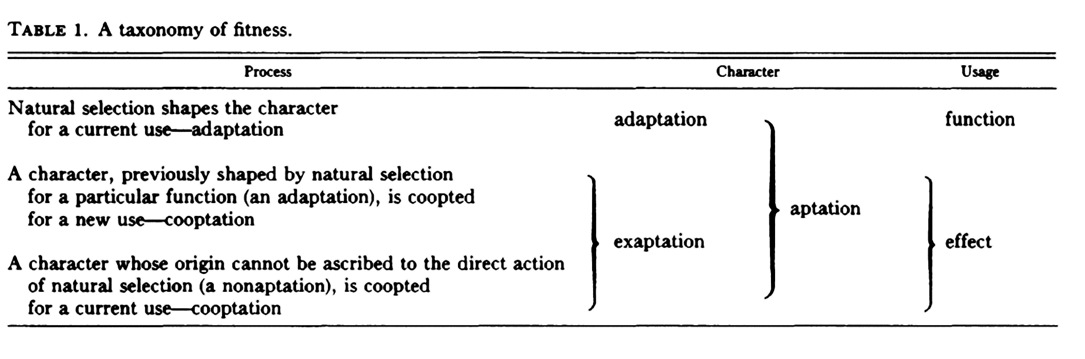 Ils suggèrent que de telles conceptions, évoluées pour d'autres usages (ou pour aucune fonction du tout), et plus tard "cooptées" pour leur rôle actuel, soient appelées « exaptations ». Ils utilisent les racines latine pour expliquer la définition des termes. Les conceptions sont aptes à jouer leur rôle actuel, donc aptus, mais elles n’ont pas été conçues pour cela, et ne sont donc pas ad aptus (adaptées). Elles doivent leur aptitude aux caractéristiques présentes pour d'autres raisons, et sont donc aptes (aptus) en raison de leur forme (ex) donc ex aptus (exaptées). Le phénomène général et statique de la condition physique devrait donc être appelé aptation et non adaptation. L'ensemble des aptations existantes à un moment donné est donc constitué de deux sous-ensembles se chevauchant partiellement: le sous-ensemble des adaptations et le sous-ensemble des exaptations.
