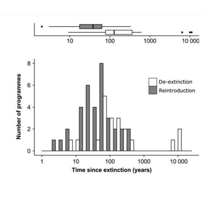 Répartition du temps écoulé depuis l'extinction (échelle logarithmique) pour les espèces candidates à l'extinction (barres blanches, n = 20), par rapport au temps écoulé depuis l'extinction locale de plusieurs programmes de réintroduction en Europe (barres grises, n = 35). Durée médiane depuis l'extinction: 129,5 ans (désextinctions) et 38 ans (réintroductions). THE ECOLOGY OF DE-EXTINCTION: De-extinction and evolution