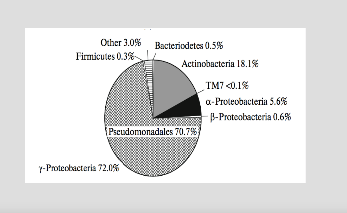 Prédominance de deux types de bactéries : les protéobactéries (81%) et les actinobactéries (18%). Faible proportion (moins de 0,9%) des firmicutes, TM7 et des bactéries du genre Bacteroidetes (cf Figure 1)
