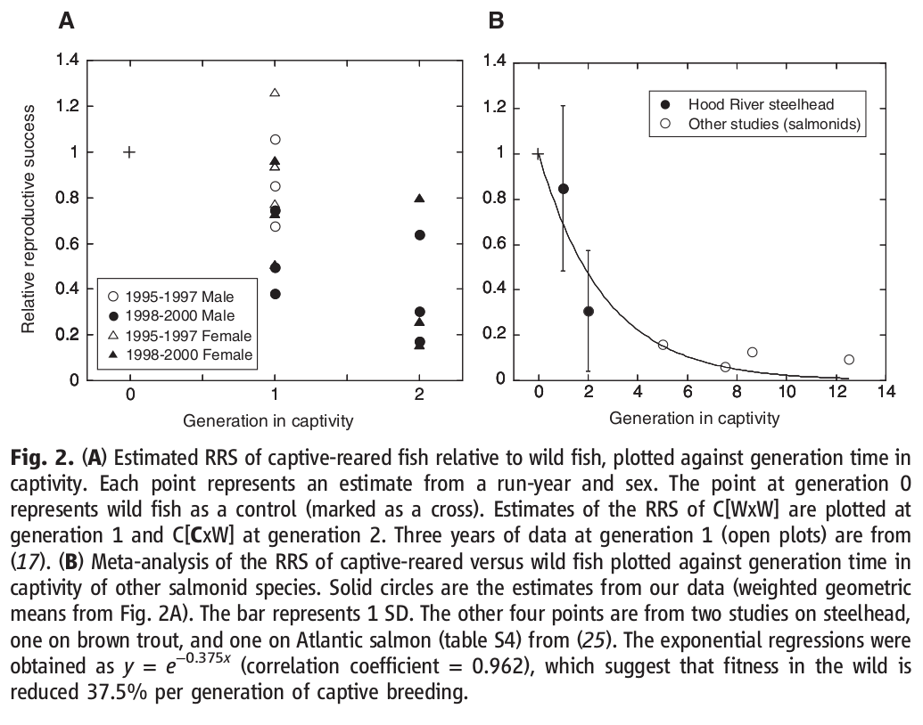 Cet article montre les effets génétiques de la réintroduction sur une espèce introduit en masse. Les études sur les faunes de poissons sont très intéressantes pour cet aspect en génétique des populations. De plus un réel effet de diminution de la fitness, via la baisse de succès reproducteur, a été mis en évidence. Enfin le caractère cumulatif de génération en génération rend la conclusion de ce papier très alarmante quand aux conséquences de la réintroduction d'espèces nées en captivité sur le très long terme.