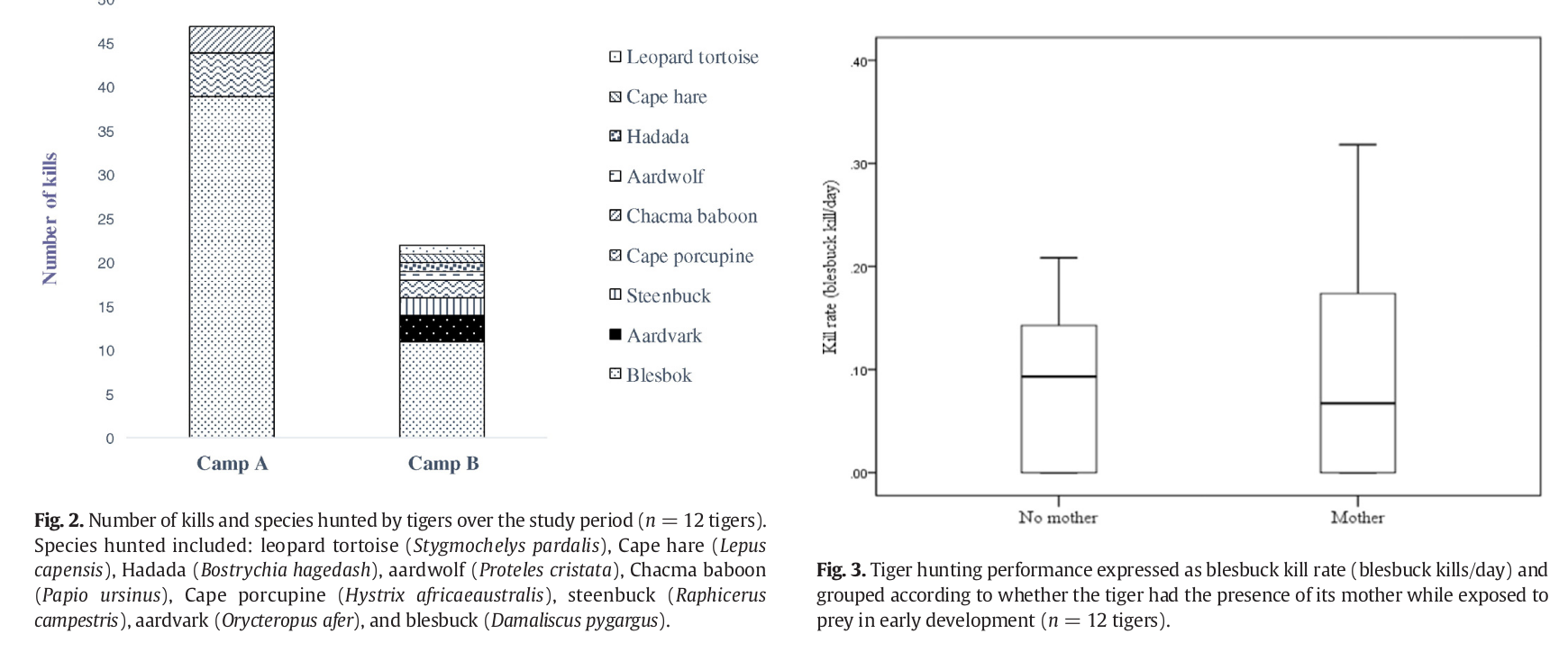 L'article montre que le succès de chasse dépend de l'éducation des petits, ainsi que de la faculté des tigres à utiliser le paysage pour se dissimuler à la vue de leurs proies. En effet, leur succès est globalement plus grand en zone couverte. Cependant, quelque soit les soins parentaux, les tigres finissent toujours par réussir à chasser, même si leur succès est plus faible s'ils n'ont pas pu observer leur mère chasser. Enfin, le régime alimentaire des tigres au cours de l'expérience montre une plasticité dans leur choix de proies.