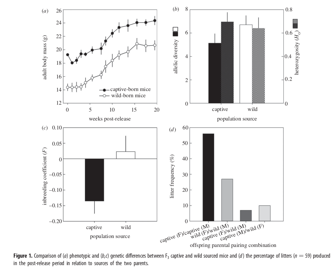 Sur la génération F1, aucune différence avec les individus sauvages n'est observée, cependant dès la F2 il y a un perte diversité génétique ainsi qu'une augmentation de l'hétérozygoticité. De plus, 83 % des descendants nés à la suite de la confrontation sont nés de parents issus du même milieu, d'où l'augmentation de l'endogamie. La cause de cette préférence pourrait être la différence phénotypique, les souris captives étant plus grosses que les sauvages. Par conséquent, le choix assortatif du partenaire d'accouplement a des conséquences réelles sur le succès de la réintroduction. Les nés-captifs ont tendance à plus s'accoupler entre eux et moins avec les sauvages, ce qui en fait un frein considérable au plan de conservation de l'espèce.