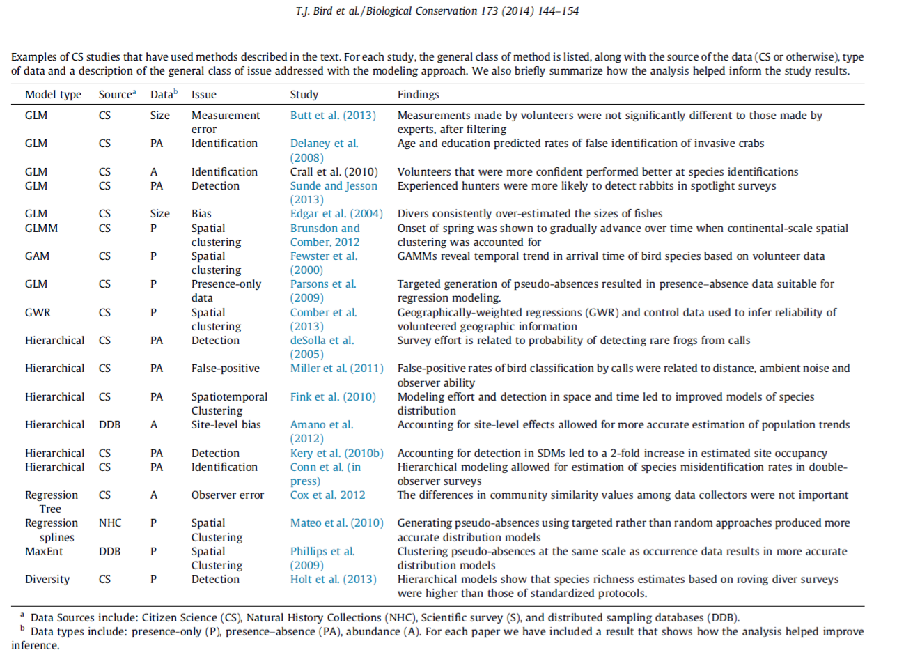 La majorité des projets de CS prennent en compte l'existence de biais et d'erreur au sein de leurs données en utilisant des approches de validation et de filtrage, l'entrainement des participants et la standardisation des données. Cependant, ces approches ne permettent pas d'éliminer l'erreur de mesure et le biais associé à la structuration spatiale des données. L'erreur aléatoire est définie comme la variation dans la réponse qui ne peut pas être décrite par les variables prédictives. Dans le contexte des projets de CS, on parle surtout d'erreur d'échantillonnage résultant des différences d'expérience ou d'intérêt entre participants. Le biais peut être subdivisé en biais systématique et en biais d'échantillonnage. Le biais systématique apparaît quand des mesures répétées d'un même processus conduisent à des sur-ou sous estimations. En revanche, le biais d'échantillonnage est le fait que certains événements sont plus probables d'être échantillonnés que d'autres.