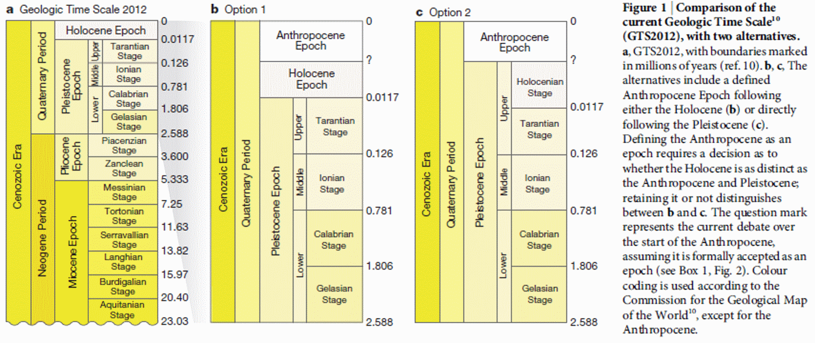 Les auteurs posent ici les différents débats qui se posent autour de la notion d’Anthropocène sans forcément remettre en cause cette proposition. Ils apportent les informations essentielles, notamment les possibles GSSP pour définir cette période et permettre au lecteur d'avoir un point de vue global sur la situation en 2015.