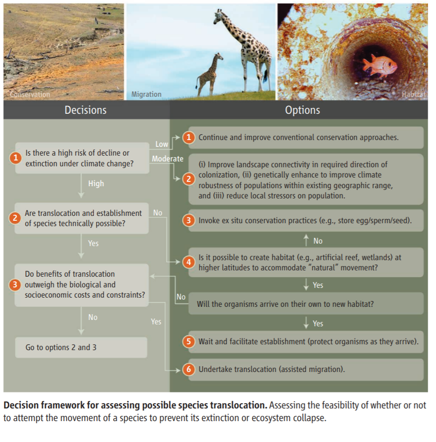 Déterminer si une espèce fait face à des risques significatifs de déclin ou d’extinction sous l’effet du changement climatique requière une connaissance profonde de la biologie de l’espèce en question ainsi que les changements biologiques, physiques et chimiques intervenant dans son environnement. Le risque d’extinction d’espèces généralistes répandues à travers une large gamme d’habitat est faible. Dans ce cas, l’option de déplacer de telles espèces hors de leurs territoires actuels doit être rejetée. D'autres espèces vont aussi suffisamment se disperser pour maintenir de grands territoires et de grandes populations. De plus, certaines espèces peuvent s’adapter in situ. Egalement lorsque les espèces sont perçues comme étant moyennement menacées par le changement climatique, il peut être suffisant de connecter leurs habitats actuels ou potentiels à des latitudes ou altitudes plus élevées. Cependant déplacer des espèces répandues dans leurs territoires peut être une option importante de conservation surtout en cas de différentiation écotypique significative. Par exemple, déplacer des populations qui sont « adaptées au chaud » (des basses latitudes) vers des lieux historiquement plus froids (les hautes latitudes) pourrait augmenter leur probabilité d’adaptation au fur et à mesure que le climat change. La colonisation assistée doit être aussi considérer pour les espèces dont les territoires sont devenus hautement fragmentés. Leur migration pour échapper au changement climatique est potentiellement bloquée par des paysages dominés par l’Homme. Ces processus de dispersion qui ont été perturbés par une perte de la connectivité entre habitat peut être rétablie par la colonisation assistée. Ce sont les espèces qui sont confinées à des habitats en voie de disparition qui présentent le plus grand challenge. Beaucoup d’espèces de montagne, par exemple, font face à la disparition des conditions climatiques qui leur sont favorables et migrent en altitude vers le sommet des montagnes.