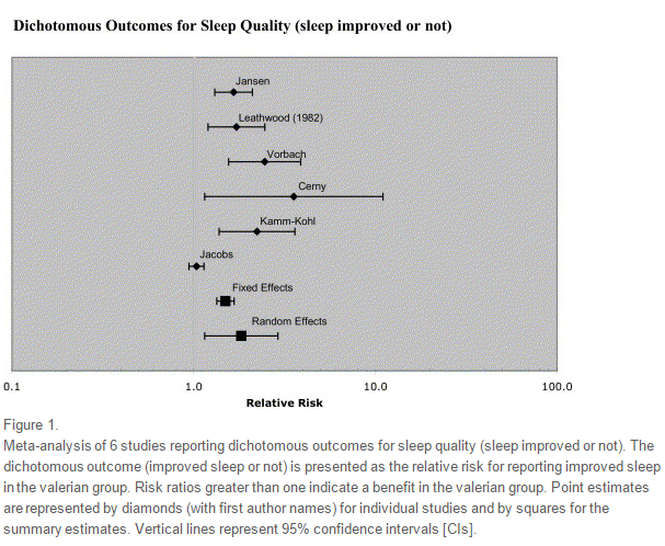 La figure montre les chances (relative risk) que le sommeil soit amélioré par la valériane dans plusieurs études (une ligne par étude) parmi les plus sérieuses identifiées. Lorsque les points sont à droite de 1,0 en abscisse, cela suggère que la valériane est efficace. Les traits correspondent aux intervales de confiance.