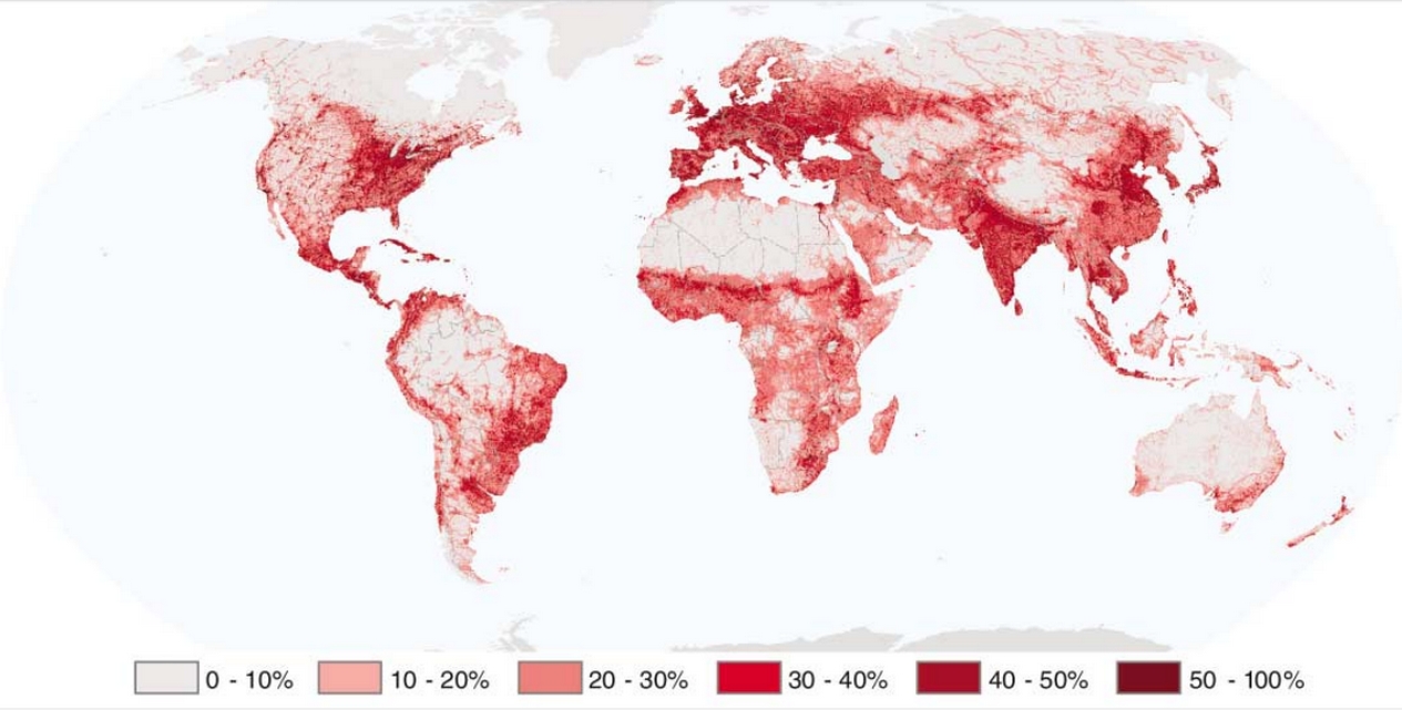 L'empreinte humaine sur Terre. Cet impact est exprimé comme le pourcentage d'influence humaine par rapport à l'influence maximale enregistrée pour chaque écosystème. Les données incluent la densité de population humaine, la transformation des terres et l'importance des communications (routes, voies navigables, etc...).