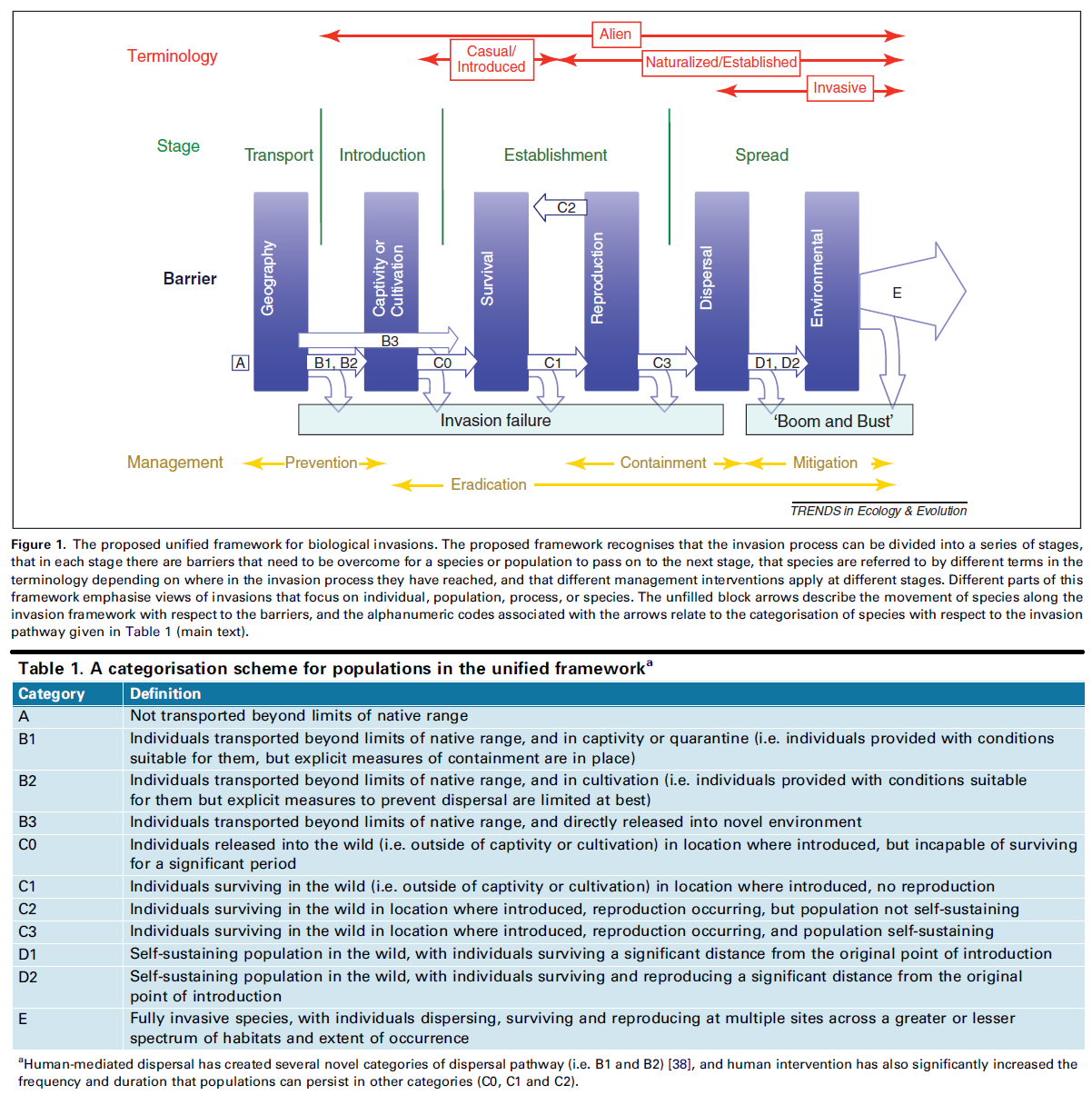 Les auteurs proposent ainsi de synthétiser des caractéristiques des deux définitions pour créer un cadre conceptuel permettant d’étudier les espèces envahissantes dont la dispersion implique l’activité humaine (voir figure). Un processus d’invasion passe ainsi par quatre étapes : le transport, l’introduction, l’établissement et la prolifération. L’étape de transport nécessite que les espèces ou les populations impliquées passent une barrière géographique (A). Vient ensuite l’étape d’introduction qui inclut des introductions dues à l’activité humaine comme le maintien en captivité ou les cultures (B1, B2). Si des individus d’une espèce sont directement transportés ou relâchés dans un nouvel environnement sans être capables d'y survivre sur une période significative, l’étape d’introduction est franchie. Vient ensuite l’étape d’établissement qui nécessite que les individus survivent (C1) et se reproduisent (C2). La combinaison de la survie et de la reproduction permet le maintien de populations. La dernière phase, la phase de dispersion, consiste alors à être capable de se maintenir à une distance significative de l’environnement d’origine (D1 et D2). Enfin, les auteurs définissent comme complètement envahissantes, les espèces dont les individus dispersent, survivent et se reproduisent sur de multiples sites à travers un spectre d’habitats plus ou moins large (E).