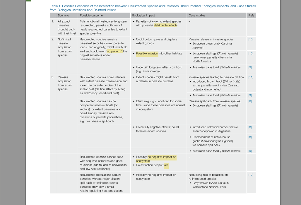 La majorité de la littérature autour de la controverse de la désextinction se consacre à débattre des aspects techniques, financiers, éthiques, écologiques et des risques liés à ce projet. Il reste néanmoins des zones d’ombre dans ce débat qui sont très peu étudiées, dont notamment les parasites associés aux espèces candidates et leurs rôles. Les auteurs ont choisi ici une définition large du terme « parasite » : macro et microparasites (bactérie, virus). Ils se sont éteints simultanément lors de la disparition de leurs hôtes, et ressusciter ces hôtes « vidés » de leurs parasites soulève divers doutes. Comment la population d’hôtes sera-t-elle régulée sans ses parasites ? Comment les réseaux trophiques seront-ils impactés avec la perte de ce maillon ? Comment l’écosystème va-t-il réagir, sachant que certains parasites agissent en tant qu’espèce ingénieur ?