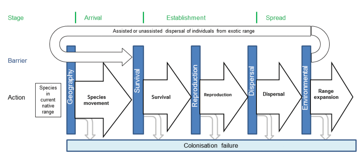 Ce cadre tient compte à la fois de la dispersion par l’intermédiaire de l’homme et de la dispersion naturelle, et reconnaît que toutes les espèces vivant dans de nouveaux environnements sont soumises aux mêmes barrières de survie, de reproduction, de dispersion et d’extension de leur aire de répartition, quelle que soit la façon dont elles y sont arrivées.