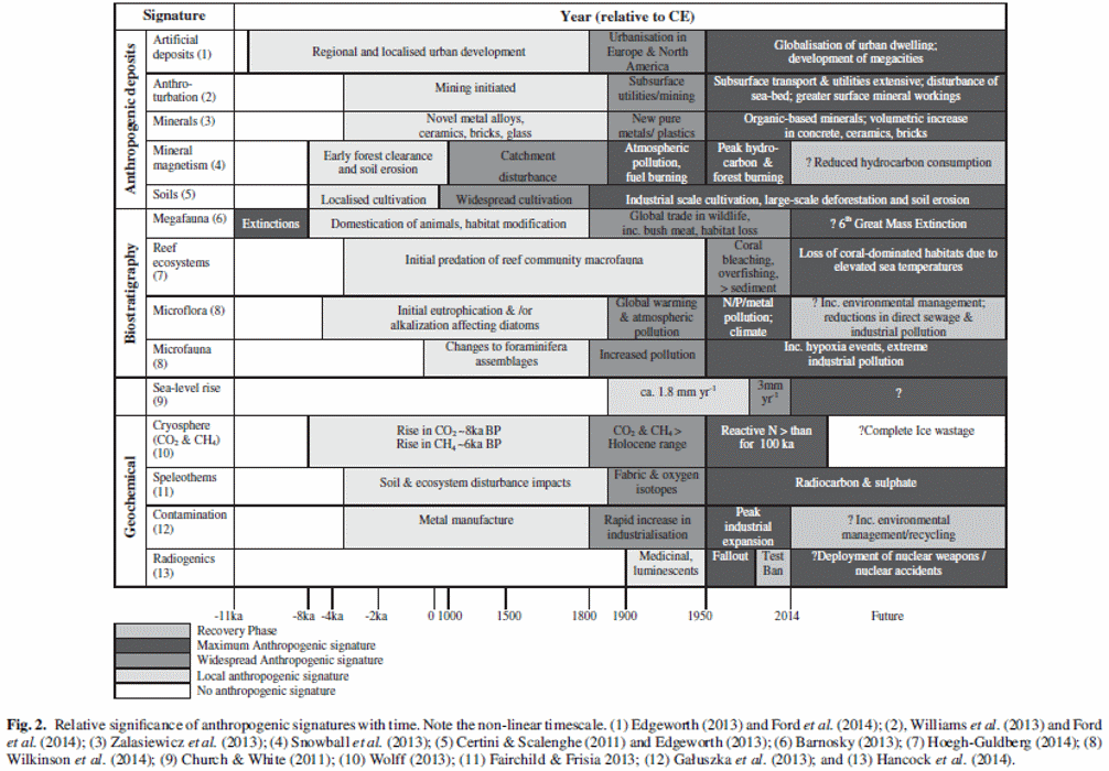 Pour se faire, le Guide Stratigraphique International exige la détermination d’un GSSP (Golden Stratotype Section and Point) ou d’un GSSA (Global Standard Stratigraphic Age). Le GSSP correspond à une localité type et le GSSA, lui correspond à un âge numérique précis. Waters et al. proposent alors dans cette review quatre options pour la base de l’Anthropocène.