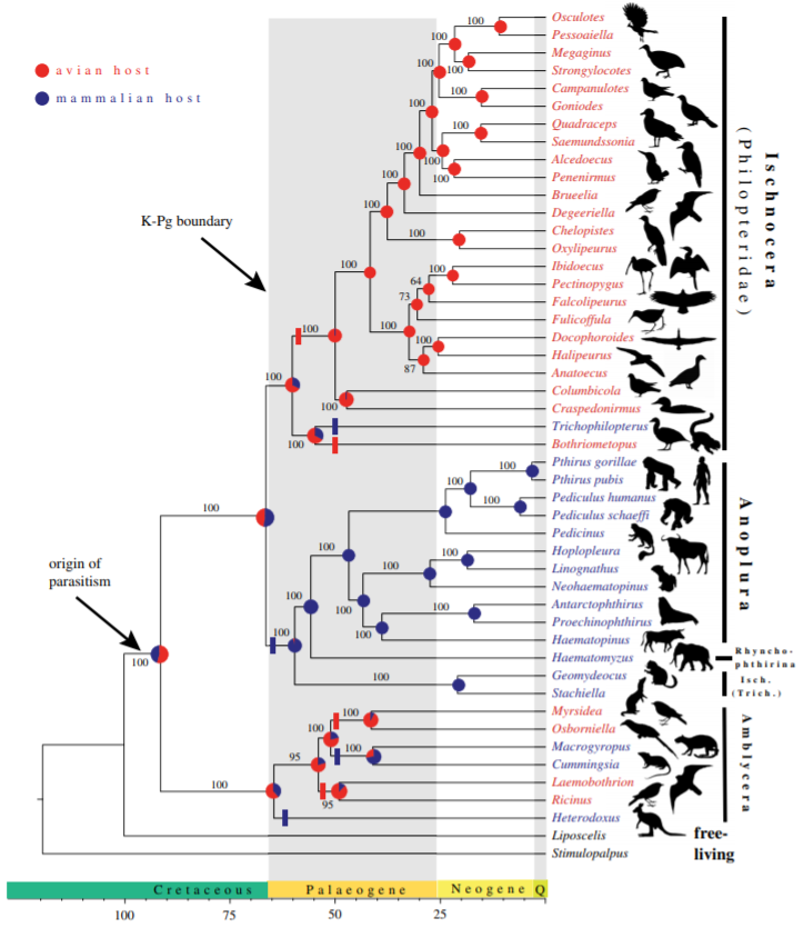 La diversification des parasites, incluant les insectes herbivores, est souvent considérée comme liée à la diversification de leur(s) hôte(s). Par exemple, plusieurs lignées majeures d'insectes herbivores se sont diversifiées à peu près en même temps que les diversifications majeures ayant lieu chez les angiospermes. Cependant, le timing de la diversification des parasites de vertébrés terrestres est peu connu. Les oiseaux et les mammifères, vertébrés sur lesquels on peut généralement retrouver des poux, se sont supposément diversifiés juste après la crise K-Pg. Il est donc possible d'évaluer si la radiation des poux présents sur les mammifères a bel et bien eu lieu après la limite K-Pg.