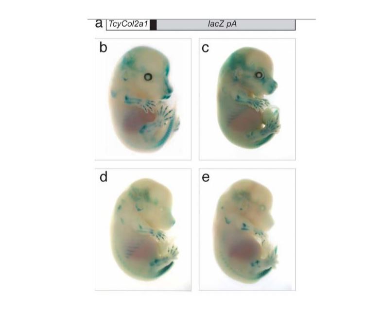 Une coloration complète a été observée chez les quatre fœtus de souriceaux selon un schéma indiquant le développement du cartilage. Ce schéma était identique à celui du gène de souris endogène Col2al et des transgènes de souris. Les coupes transversales histologiques ont confirmé que l'expression de LacZ, dirigée par l'activateur transcriptionnel du thylacine, était limitée aux chondrocytes en développement.