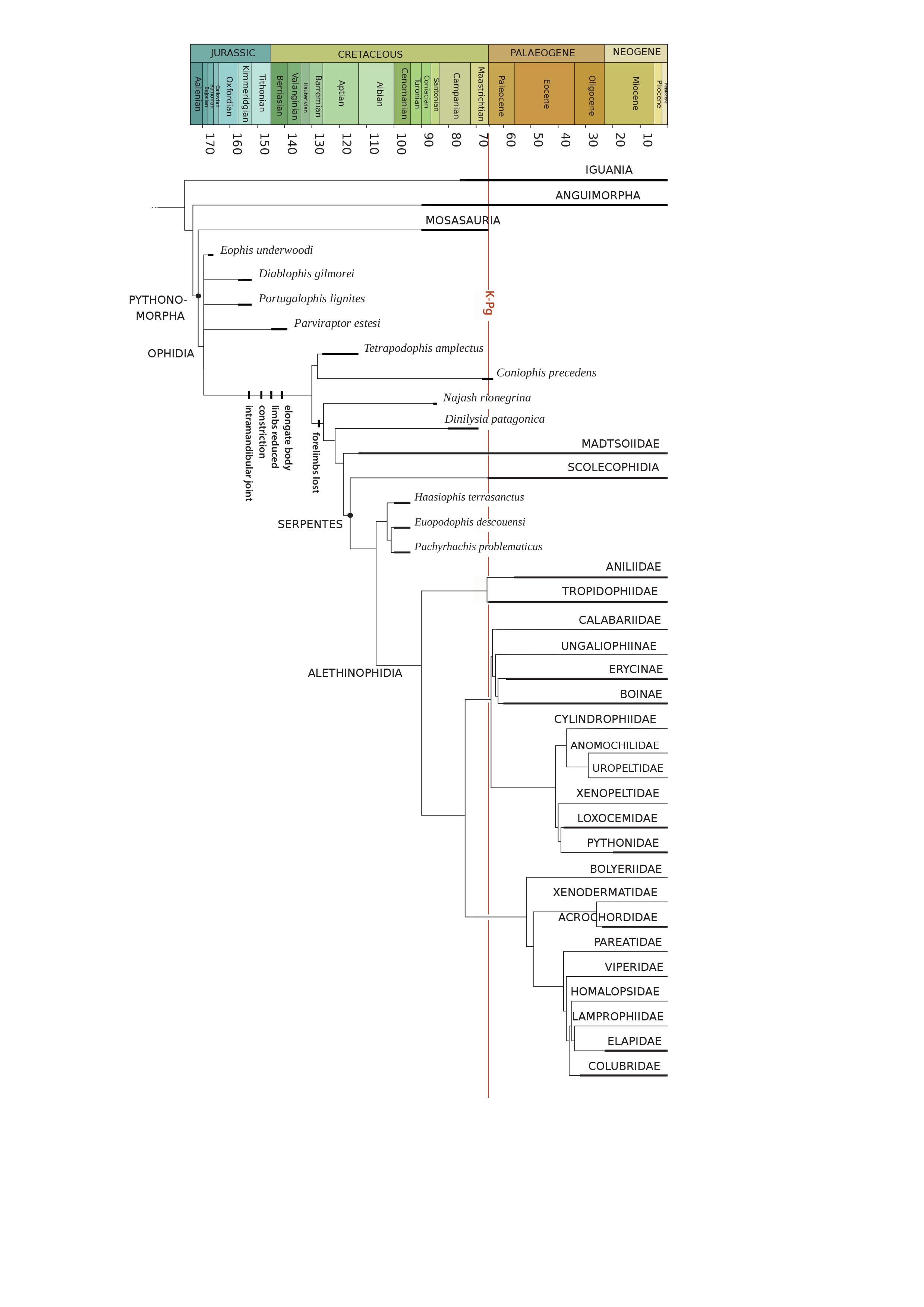 Dans chaque analyse, T. amplectus apparaît comme un serpent basal (Figure).Ce résultat ajouté aux caractères fouisseurs qu'il possède comme un long tronc, une queue courte, des épines neurales courtes, T. amplectus supporte, selon les auteurs, la théorie de l'ancêtre terrestre fouisseur et non marin.