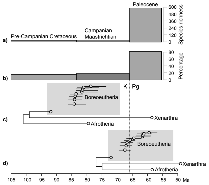 Chronologie de l'évolution des mammifères placentaires. a) Richesse spécifique du registre fossile des euthériens b) Richesse spécifique du registre fossile des euthériens exprimé en pourcentage d'espèces de mammifères durant le crétacé pré Campanien, le Campanien-Maastrichtien et le Paléocène pour réduire les biais d'échantillonnage. c) datation géomoléculaire des divergences inter-ordinales des euthériens avec les calibrations de Meredith et al (2011) d) datation géomoléculaire des divergences inter-ordinales des euthériens avec les calibrations de Dos Reis et al (2012)