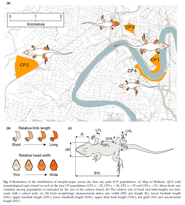 L'isolement par l'adaptation peut contribuer à l'évolution locale de phénotypes morphologiques différents entre sites urbains. La différence d'habitats peut affecter la morphologie des espèces et il est connu que les lézards montrent des adaptations morphologiques pour optimiser leur performance fonctionnelle. De longs membres postérieurs ou de petits membres ne permettent pas les mêmes avantages fonctionnels.