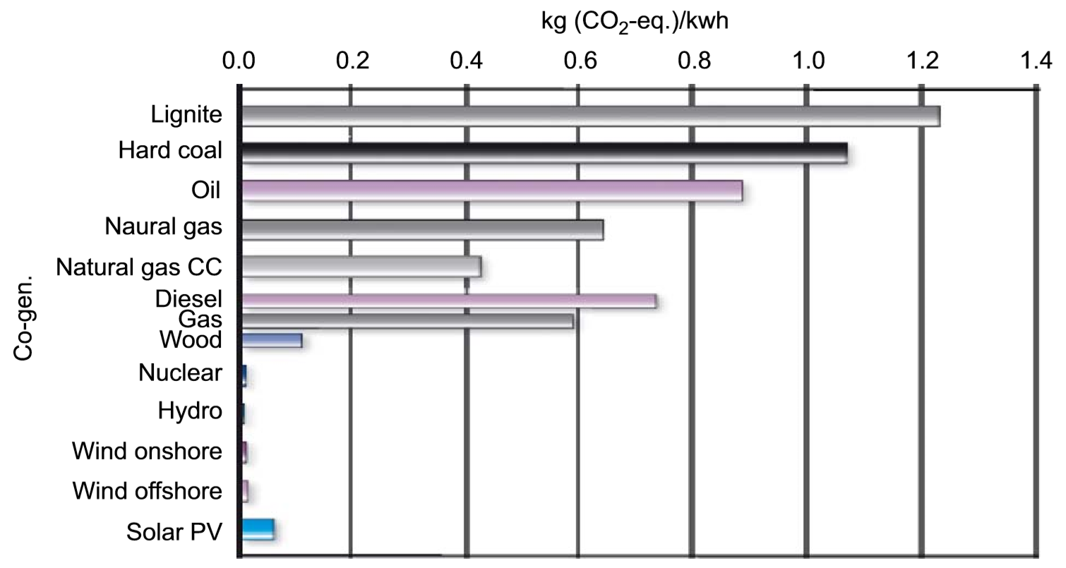 Emissions de gaz à effet de serre pour différentes chaînes énergétiques. Source : OECD/NEA-IAEA (2008) - basé sur Dones et al. (2004)