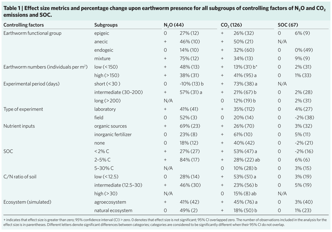La capacité qu’ont les vers de terre à augmenter la fertilité du sol ainsi que la stabilisation du carbone réside principalement dans le fait qu’ils accélèrent la décomposition et favorise l'agrégation des sols. Ils stimulent la séquestration du carbone dans les agrégats du sol, mais ils augmentent aussi les émissions des principaux gaz à effet de serre (GES) tels que le dioxyde de carbone et le protoxyde d’azote. Par conséquent, la question de savoir si les vers de terre affectent principalement les sols pour agir comme source ou puits net de gaz à effet de serre demeure très controversée. Les auteurs présentent ici un examen quantitatif de l'effet global des vers de terre sur le bilan gaz à effet de serre du sol. Les résultats suggèrent que bien que les vers de terre soient largement bénéfiques pour la fertilité des sols, ils en augmentent les émissions nettes de gaz à effet de serre (+33% pour le CO2 et +42% pour le N2O).