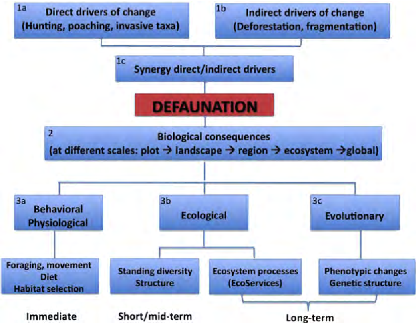 La défaunation, caractérisée par le déclin de population de moyens et grands vertébrés, représente une menace importante pour la biodiversité des écosystèmes tropicaux. La défaunation est provoquée par des facteurs anthropiques, directement par la chasse, le braconnage et le commerce illégal d’animaux ou indirectement via la déforestation et la fragmentation des habitats. Les implications biologiques de la défaunation sont multiples et peuvent se produire à diverses échelles spatiales, que ce soit au niveau de la parcelle, du paysage, de la région, de l’écosystème et enfin, au niveau global. Ces impacts sur les systèmes biologiques peuvent aussi se produire à différentes échelles temporelles (immédiats, à court ou long terme). Il est notamment relevé des impacts sur les comportements physiologiques (atteinte aux performances reproductive des végétaux et déplacements des animaux en recherche d’aliments), l’écologie (perturbations du fonctionnement des écosystèmes) et sur l’évolution (changements phénotypiques et structure génétique des populations).