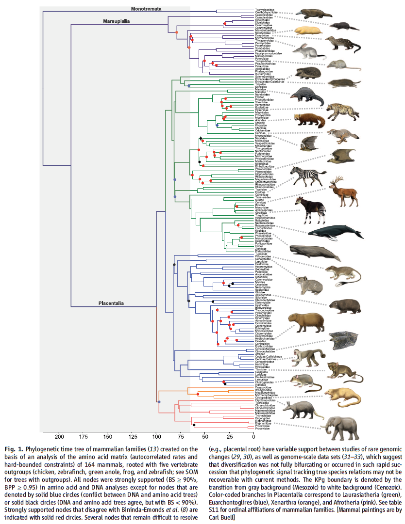 Figure 1: Phylogramme des familles de mammifères basé sur l'analyse d'une matrice d'acides aminés de 164 mammifères, enraciné avec 5 groupes externes de vertébrés (poulet, anole, grenouille, poisson-zèbre, diamant mandarin). Tous les nœuds sont robustes (BS ≥ 90%, BPP ≥ 0,95) dans les analyses d'acides aminés sauf les noeuds représentés par des cercles bleus (conflit entre les arbres basés sur l'ADN et les acides aminés) ou des cercles noirs (accord entre les arbres basés sur l'ADN et les acides aminés mais BS <90%). Les cercles rouges représentent les noeuds robustes qui sont en désaccord avec Bininda-Emonds et al. 2007. La limite K-Pg est indiquée par la transition entre le fond gris (Mésozoïque) et le fond blanc (Cénozoïque). Les branches vertes correspondents aux Laurasiatheria, les bleues aux Euarchontoglires, les orange aux Xenathra et les roses aux Afrotheria.