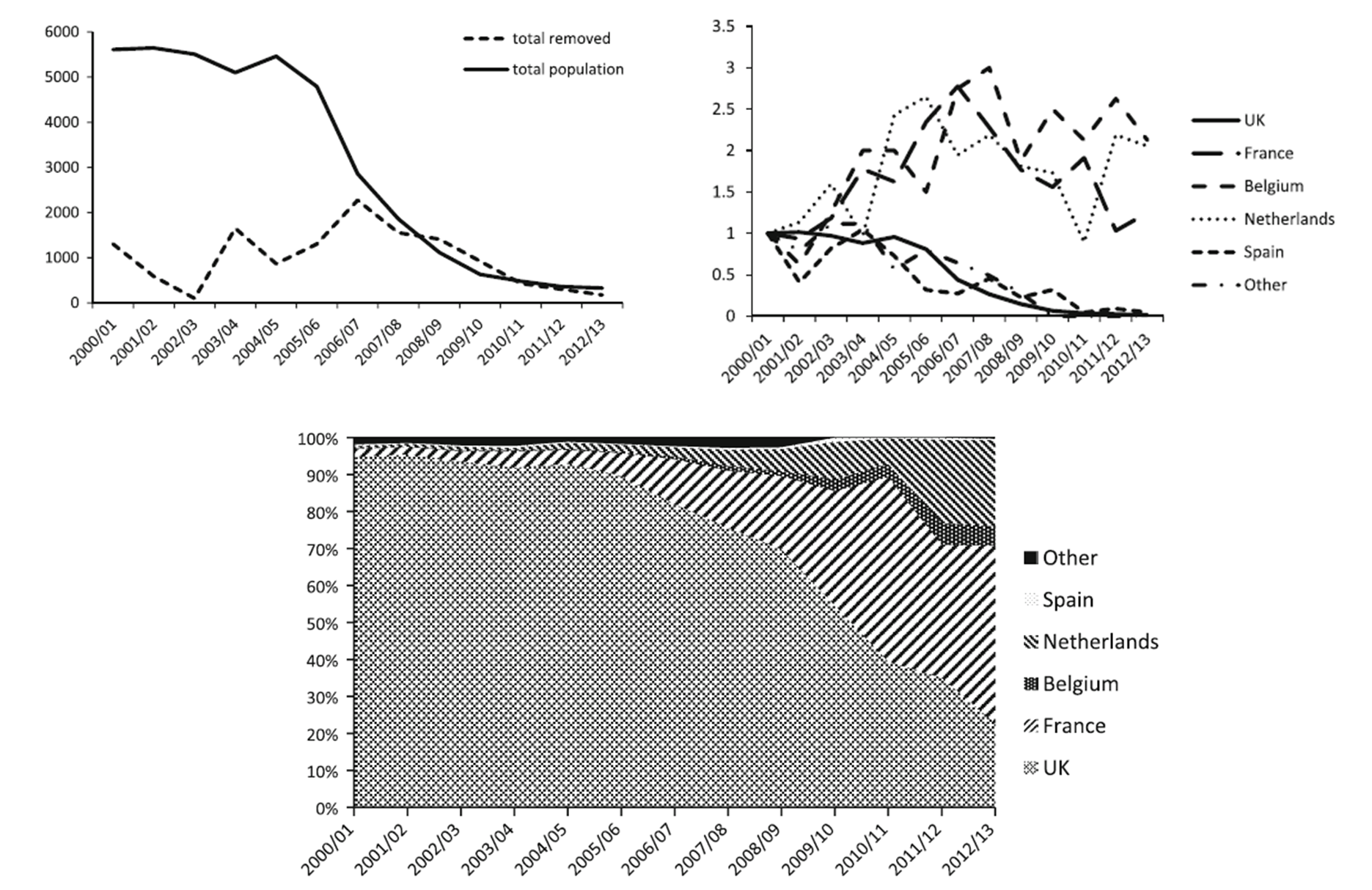 (Haut gauche) Tendance de la population totale déclarée d'Érismature rousse et nombre total d'individus supprimés par année en Europe, 2000-2013
