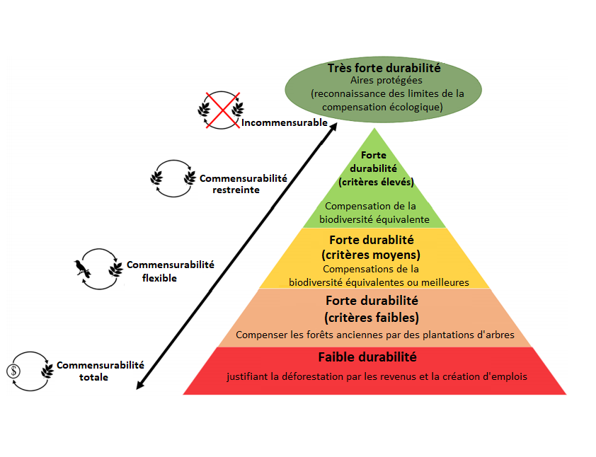 Les préoccupations et l'intérêt sont croissants pour la biodiversité et notamment la compensation écologique. Dans un contexte fortement marqué par les activités économiques, il y a une classification des environnements écologiques selon l'estimation de leur valeur (Figure). Cette valeur nommée commensurabilité intègre les différentes qualités mesurées, les coûts et les avantages liés aux bénéfices que nous apporte la nature (services écosystémiques). La commensurabilité permet ensuite de comparer différents environnements et d'évaluer la compensation écologique.