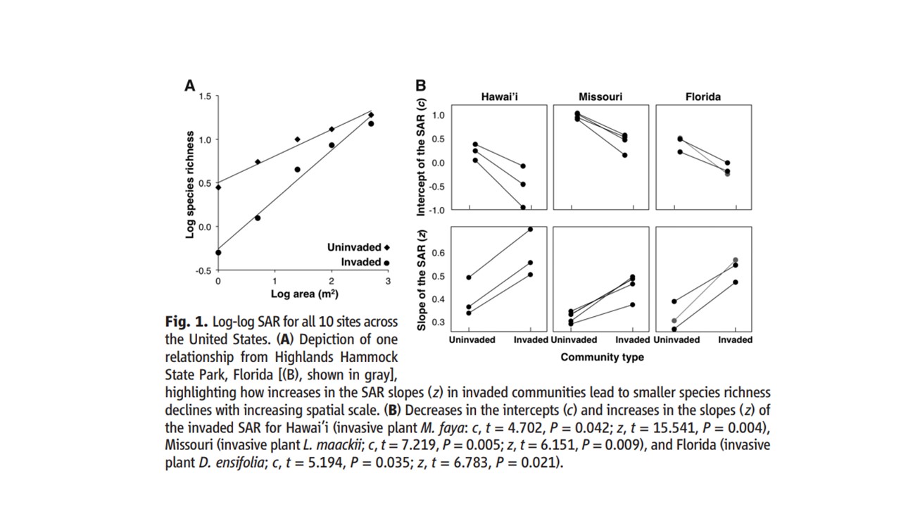 Les auteurs ont émis l'hypothèse que cet écart d'échelle spatiale peut être résolu en comprenant comment les espèces envahissantes modifient l'échelle de la richesse des espèces avec l'aire. La relation espèce-aire (SAR), S = cAz, où S est le numéro de l'espèce, A est l'aire, et c et z sont des constantes. Plus précisément, l'effet des espèces envahissantes sera de plus en plus tempéré par l'échelle d'échantillonnage si l'envahisseur augmente la pente (z) du log-log SAR [log (S) = zlog (A) + log c)]. L'influence dépendante de l'échelle des espèces végétales envahissantes a été étudiée , que nous définissons comme le sous-ensemble des espèces végétales non indigènes qui ont des taux de croissance démographique élevés et deviennent des membres dominants de la communauté dans laquelle elles sont introduites.