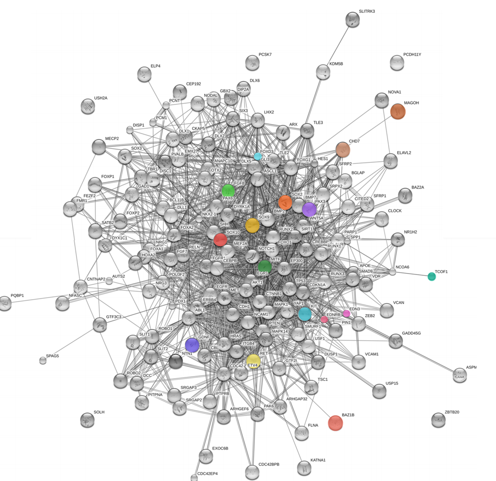 Leur recherche bibliographique a aussi montré que près de 60% de ces gènes jouait un rôle lié à la crête neurale. le réseau ne représente que des connectivités *potentielles * entre les protéines impliquées. Les auteurs signalent que ces interactions doivent encore être cartographiées sur des réseaux biochimiques particuliers, des voies de signalisation, des propriétés cellulaires, des aspects de la fonction neuronale ou des types de cellules d'intérêt qui peuvent être reliés à des aspects de développement et des fonctions du langage.