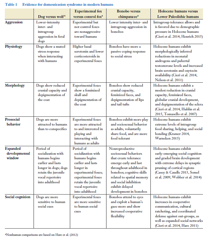 L'évolution de la lignée humaine est marquée par l’apparition de traits phénotypique du syndrome de domestication dont la dépigmentation, la féminisation crano-faciale, la baisse d’agressivité et les comportements prosociaux soutenue par des preuvent neurobiologique et paléontologique supposent une évolution tardive dominée par la sélection pour la prosocialité intra-groupe.
