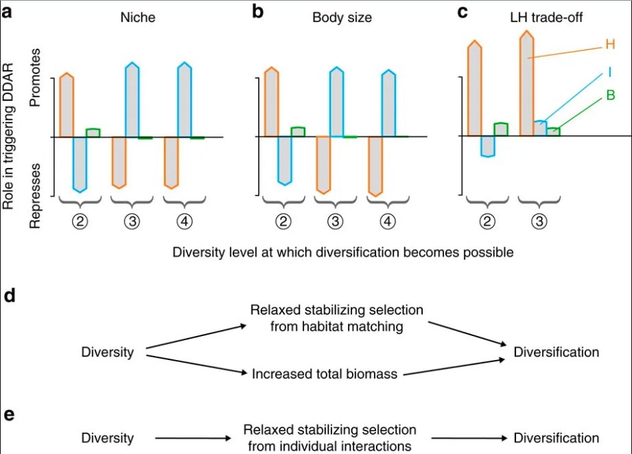 Les effets de ces paramètres sur la transition vers la diversification sont donnés en fonction du nombre d'espèces initiales nécessaires pour engranger un tel phénomène : deux (2), trois (3) ou quatre espèces (4). . (d-e) Diagrammes synthétiques résumant les impacts positifs de la diversité sur la diversification, à des niveaux bas (d) ou élevés (e) de diversité.