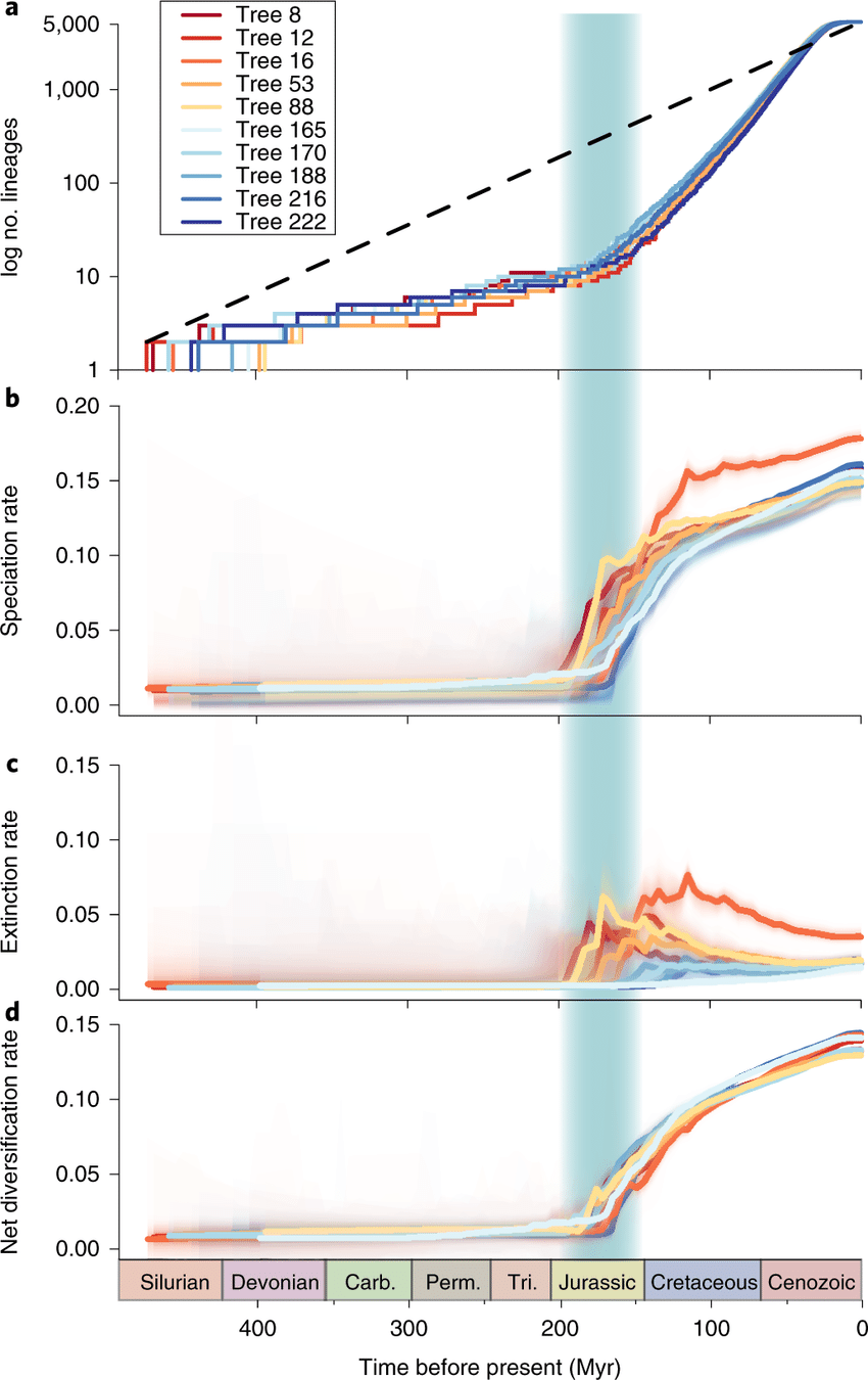 Les taux d'extinction et de spéciation globaux ont été examinées par une analyse bayésienne des mélanges macro-évolutionnaires (BAMM) afin d'en voir les variations au fil du temps et selon les lignées.