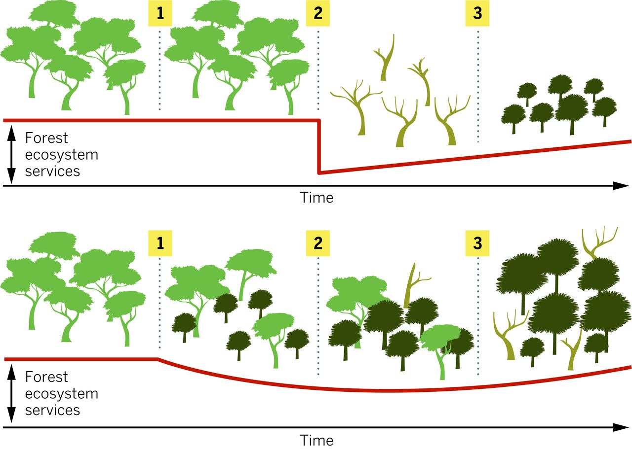 (Bottom) (1) Managers anticipate an impending forest transition and facilitate it by reducing the probability of sudden die-back and by assisting establishment of species better adapted to future conditions. (2) The transition is gradual rather than abrupt, and ecosystem services are maintained at a higher (although reduced) level. (3) Forest ecosystem services more rapidly approach their original levels.**