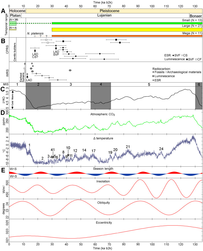 Figure 7 de la méta-analyse. Chronostratigraphie des derniers 135 000 ans sur les sites étudiés. A) la distribution temporelle de la mastofaune dans un des sites côtiers étudiés "CPRS" (la largeur de chaque barre est proportionnelle au nombre de taxons) B)les différentes datations documentées pour deux sites étudiés, un côtier "CPRS" et un continental "WRS" LAD : dernière apparition de la mégafaune et arrivée de l'Homme dans deux sites étudiés(CF: Cordão Formation, CS: Continental Shelf, SVF: Santa Vitória Formation, TPF: Touro Passo Formation) C) période glaciaire (grisé)/interglaciaire D) variation de la concentration atmosphérique en CO2 et de la température relative au présent E) estimation de la durée relative hivernale (W) et estivale (S) selon la théorie de Milankovitch et les paramètres d'orbite.