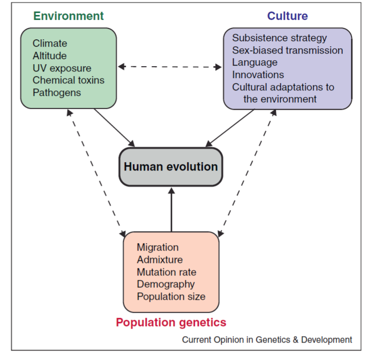 Différents projets d'étude de la génétique mondiale de l'Homme, tels que 1000 Genomes, ont montré qu'il existe des clusters d'individus génétiquement proches correspondant à leur situation géographique. Il a ainsi été démontré que l'évolution de l'Homme, en plus des pressions de sélections environnementales et des taux de mutations, est également liée à l'histoire démographique et migratoire de chaque population. De même, la culture impacte l'héritage et la transmission de certains caractères génétiques: elle peut modifier l'avantage sélectif de certaines mutations en limitant ou favorisant sa propagation. Un exemple de ce phénomène est le lien entre le développement de la consommation de produits laitiers et l'augmentation du variant génétique permettant la persistance à l'âge adulte de la lactase.