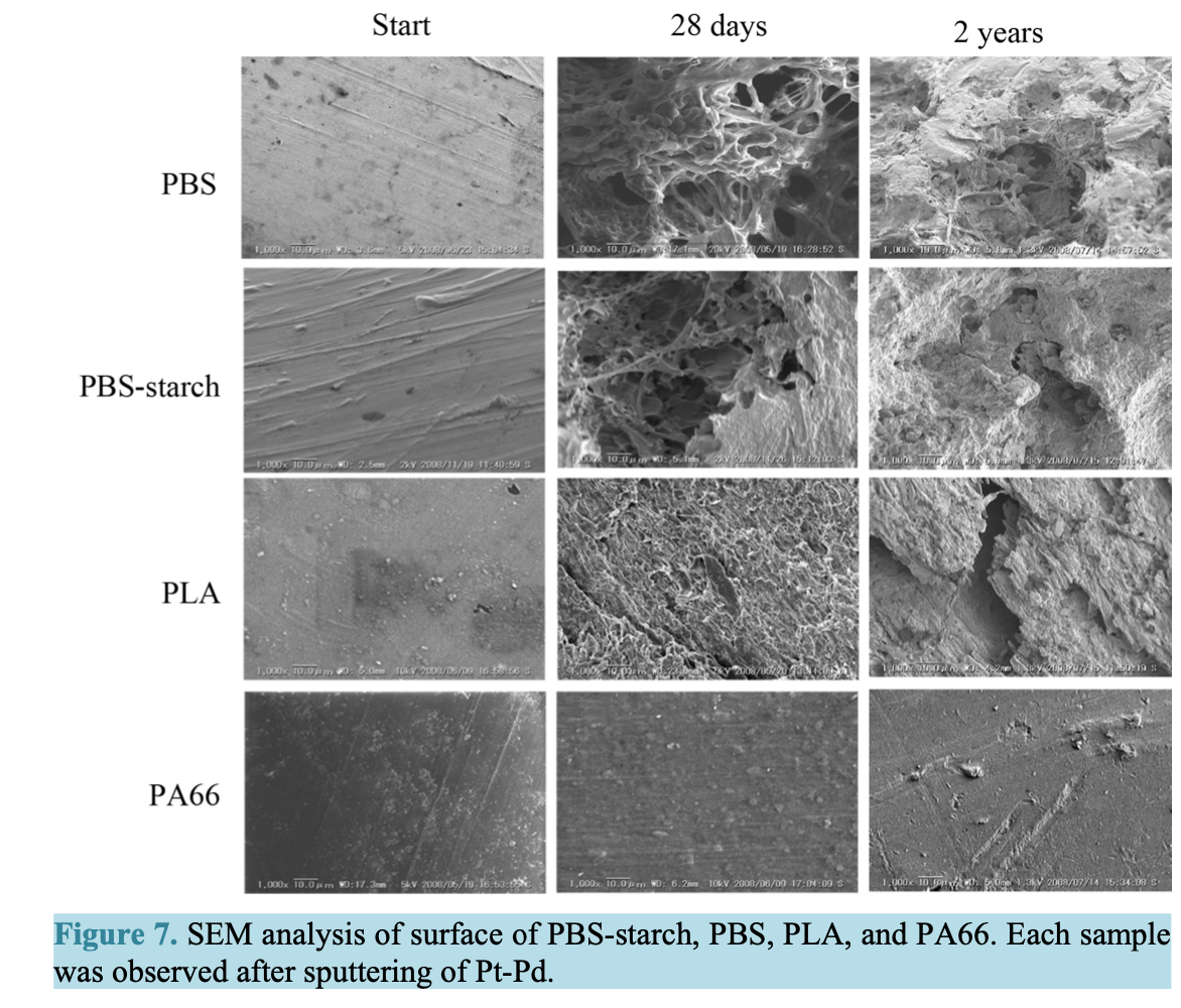 Analyse par SEM (microscopie électronique à balayage) de la surface des 4 plastiques analysés (PBS, PBS-amidon, PLA, PA66) au début, à 28 jours et après 2 ans, montrant leur dégradation. Chaque échantillon a été observé après pulvérisation de platine et palladium. (Adhikari et al. 2016)[1]