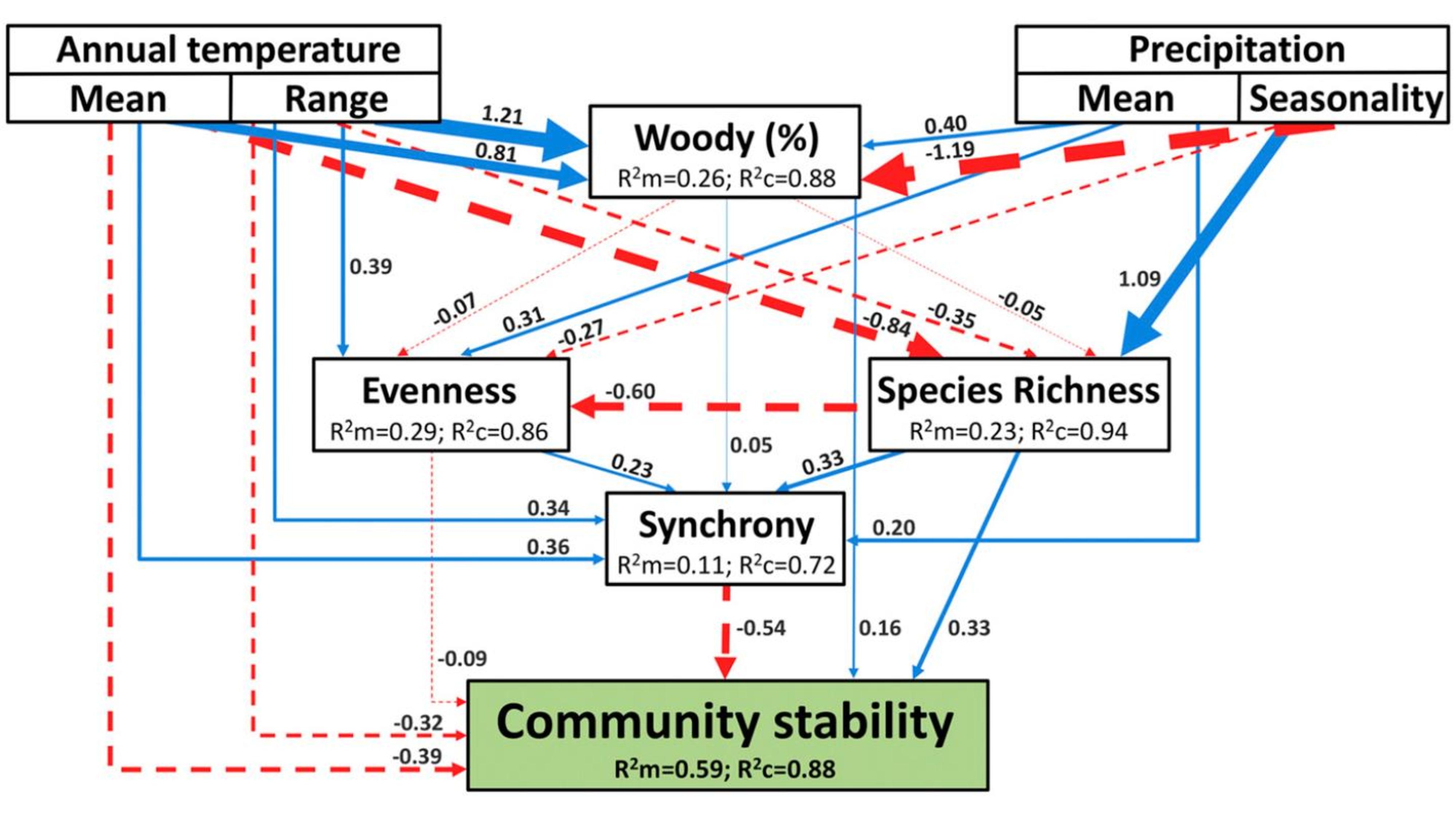 Modèle d'équation structurelle par morceaux montrant les effets directs et indirects de multiples facteurs abiotiques et biotiques sur la stabilité dans les 79 ensembles de données (Statistique C de Fisher : C = 14,96, P = 0,134, n = 7 788). Valeurs marginales (R2m) montrant la variance expliquée par les effets fixes et valeurs conditionnelles (R2c) montrant La variance expliquée par l'ensemble du modèle est fournie pour chaque variable de réponse. Les lignes continues représentent les effets positifs, tandis que les lignes pointillées indiquent les effets négatifs effets. Les lignes bleues et rouges représentent les effets statistiquement significatifs, et les lignes grises représentent les effets non significatifs. La largeur de chaque flèche est proportionnelle à les coefficients de cheminement normalisés.