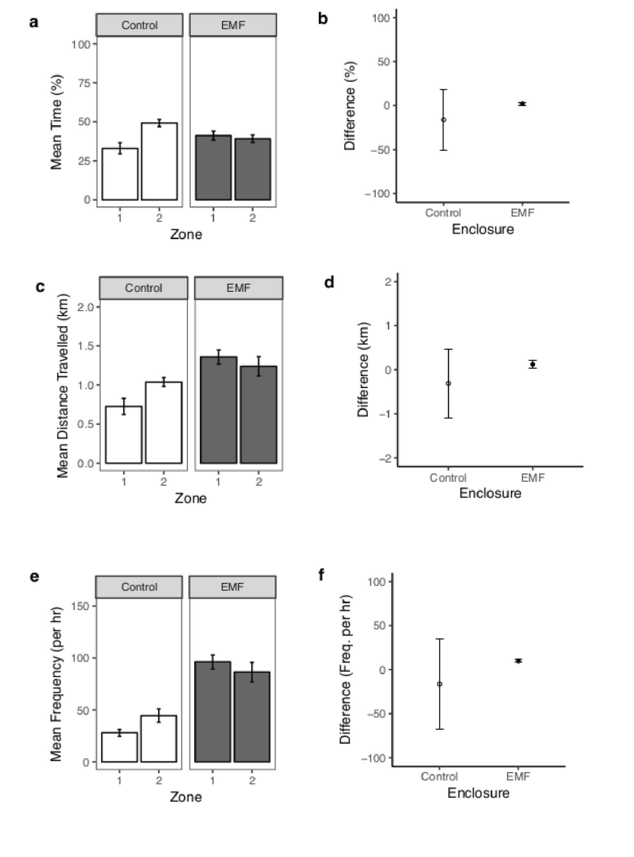 Anthropogenic electromagnetic fields (EMF) influence the behaviour of bottom-dwelling marine species Figure 3. Comportement des raies dans chaque zone des enclos: (a) La moyenne du groupe (± SE) du temps passé par les raies dans chaque zone (Zone 1> 52,6 µT, Zone 2 <49,7 µT) de chaque enceinte, (b) la différence des moyennes arithmétiques (± 95% CI) du temps passé dans chaque zone (c.-à-d. Zone 1 - Zone 2) de chaque enceinte. (c) La moyenne (± ET) de la distance totale parcourue par jour par les raies dans chaque enceinte avec (d) la différence des moyennes arithmétiques (± 95% IC) de la distance parcourue dans chaque enceinte. (e) La moyenne de groupe (± ET) de la fréquence des grands virages par heure par raie dans chaque enceinte avec (f) la différence moyenne arithmétique (± 95% IC) de la fréquence des grands virages par heure dans chaque enceinte.