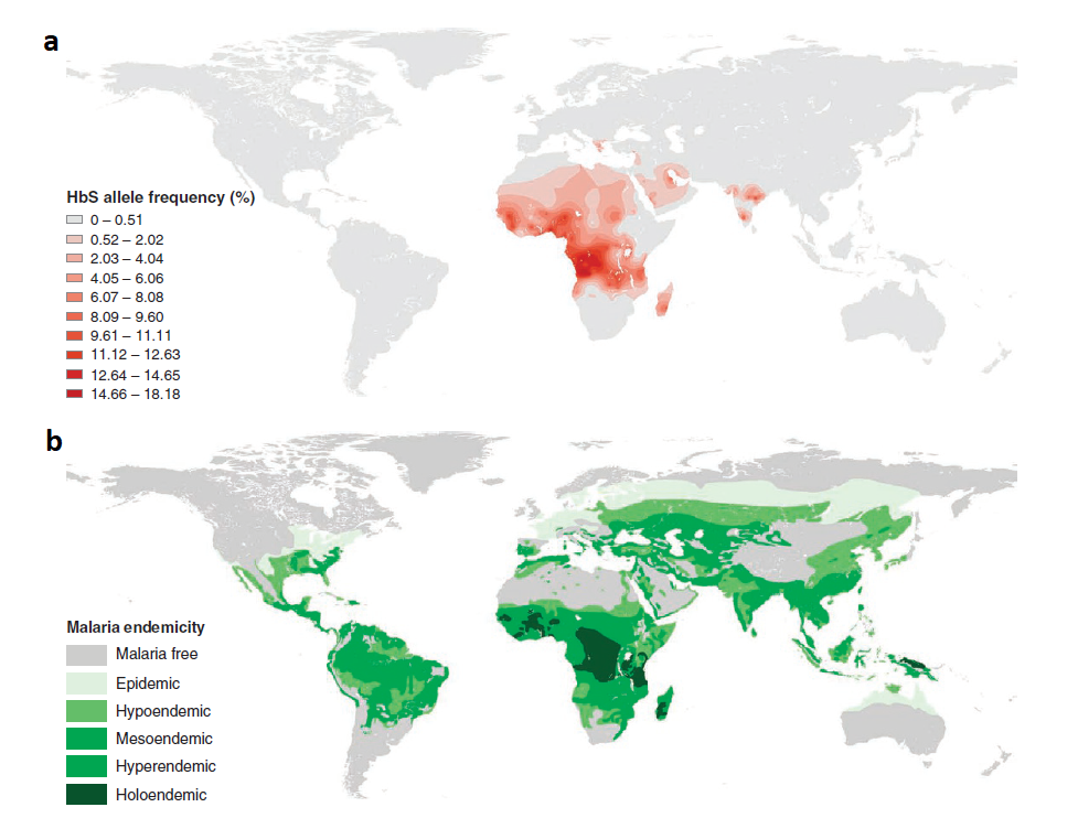 Par des analyses in vitro et in vivo, il a été décrit que la forme hétérozygote de cette maladie confère une protection contre le paludisme du à Plasmodium falciparum, donnant naissance à l'hypothèse malarique, supposant que l'allèle HbS protège du paludisme. Afin de confirmer cette hypothèse à l'échelle globale, les auteurs de cet article ont comparé la fréquence allélique de HbS et les données géographiques d'endémicité de la malaria.