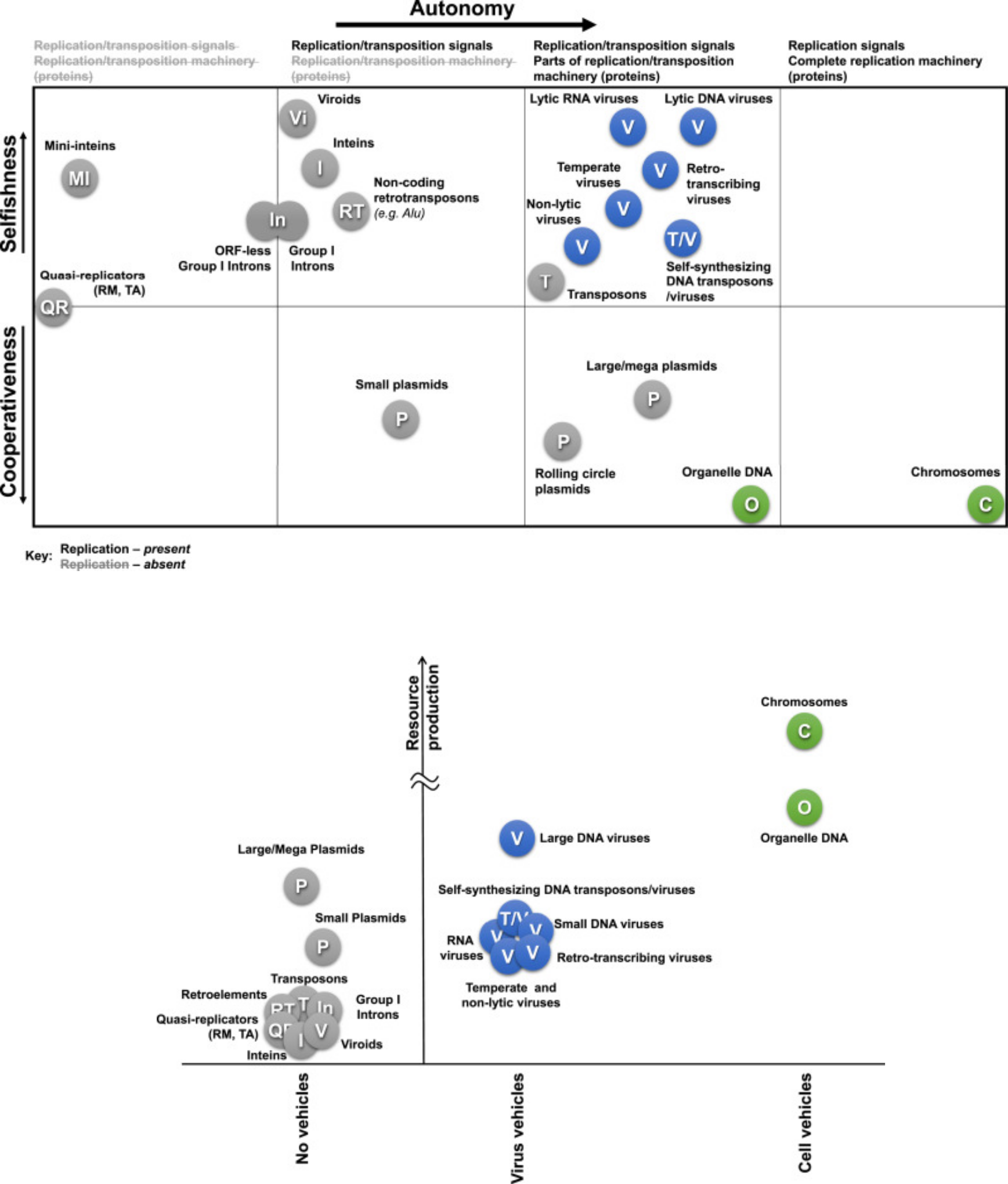 En haut : classification des réplicateurs en fonction de leur autonomie et de leur stratégie (en bleu sont représentés les virus et en vert les cellules)
