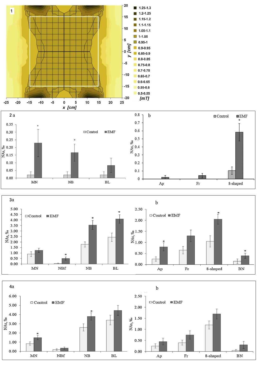 1)Répartition des EMF dans l'aquarium du groupe test; 2)Anomalies cellulaire chez O.mykiss : aIndices de génotoxicité,b Indices de cytotoxicité; 3)Anomalies cellulaire chez L.balthica : aIndices de génotoxicité,b Indices de cytotoxicité; 4)Anomalies cellulaire chez H.diversicolor : aIndices de génotoxicité,b Indices de cytotoxicité. Les " * " indiquent les anomalies significativement plus élevées chez le groupe test par rapport au groupe contrôle.